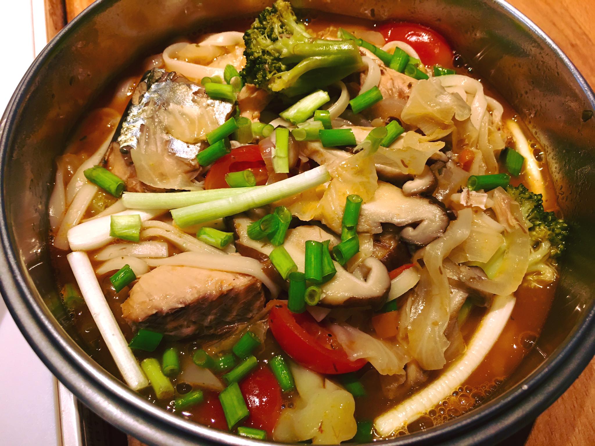 端午連假首日之午餐~橄欖油茄汁鯖魚蔬菜麵